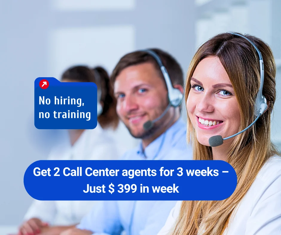 For just $399 in week, you get a 3-week trial with two dedicated call center agents working 6 hours a day, 5 days a week, focused 100% on your business.